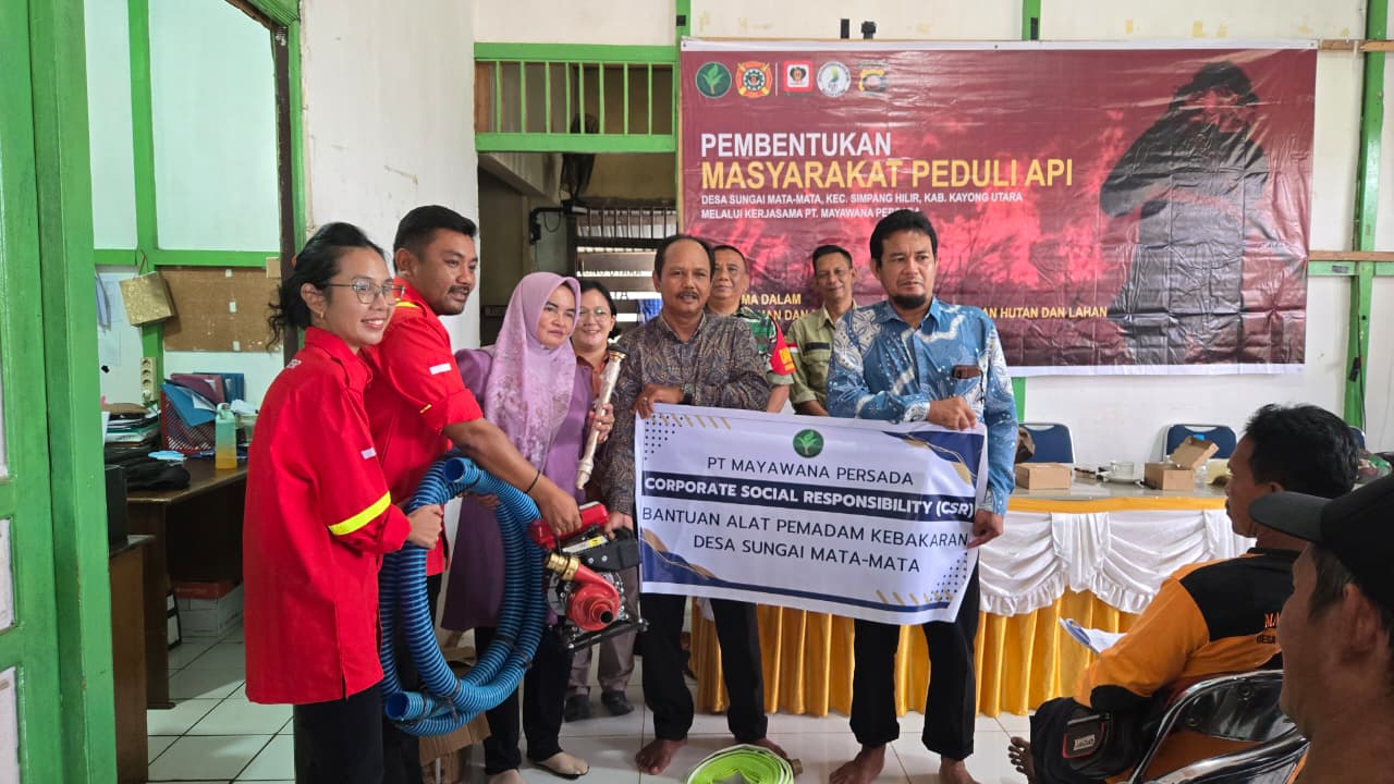 Bantuan tersebut berupa seperangkat alat pemadam kebakaran, seperti mesin pompa jinjing, selang hisap, nozzle dan lainnya. Kepala Desa Sungai Mata-Mata, Kartini menyambut baik kegiatan pelatihan Karhutla yang dilakukan PT Mayawana Persada. Menurut Kartini, potensi Karhutla di daerahnya cukup tinggi. “Mudah-mudahan dengan adanya relawan MPA yang dilatih PT Mayawana Persada, Karhutla di daerah kami, bisa dicegah, atau berkurang, syukur-syukur hilang sama sekali,” kata Kartini. Ketua MPA Desa Sungai Mata-Mata, Raden Japarani mengaku bangga bisa menjadi bagian dari relawan MPA. Raden mengatakan, tidak ada paksaaan atau iming-iming apa pun yang membuat dirinya bergabung menjadi relawan MPA. “Saya jadi relawan MPA murni panggilan hati dan rasa peduli saya terhadap tingginya tingkat Karhutla di desa kami. Begitu juga dengan teman-teman yang lain. Semuanya murni panggilan hati untuk bergabung dalam MPA,” jelas Raden. Humas PT Mayawana Persada Yohanes Supriyadi mengatakan, relawan MPA akan mendapat bimbingan serta panduan dari perusahaan apabila mengalami kesulitan dalam bertugas nanti.